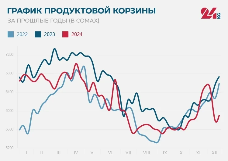 В 2024 году стоимость продуктовой корзины уменьшилась на 743 сома. Самая низкая цена была зафиксирована 14 сентября — 5 тысяч 510 сомов, а самой высокой корзина была 13 апреля — 7 тысяч 18 сомов.