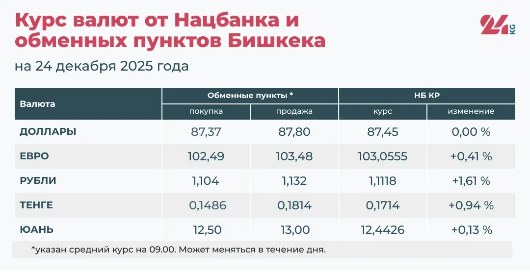 - Средний курс в обменниках: покупка — 102,49 сома, продажа — 103,48 сома.
