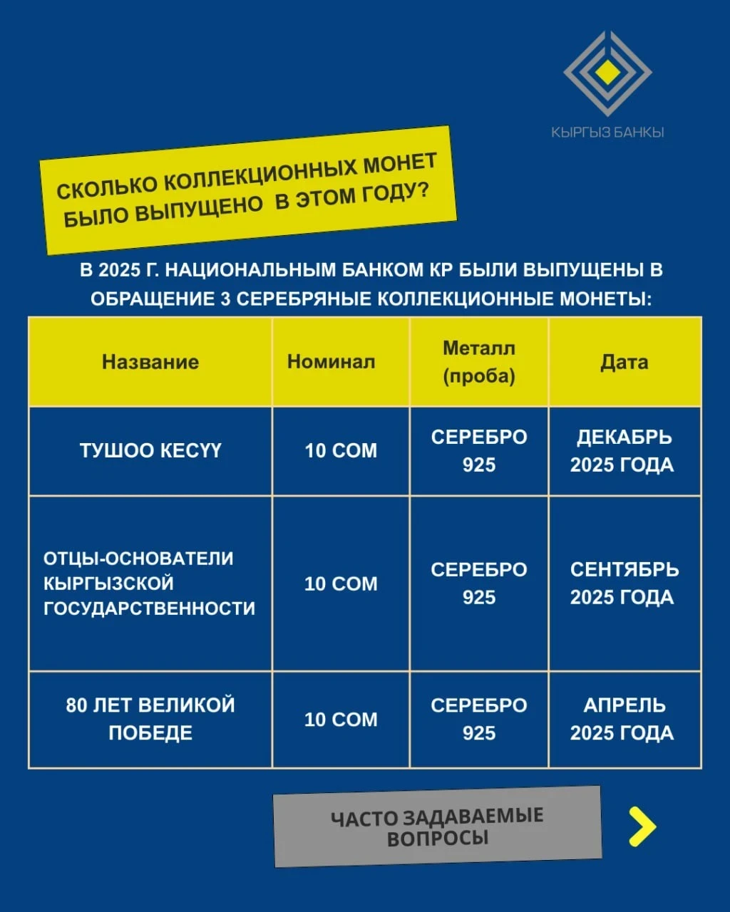 В 2025 году в оборот были введены три новые серебряные коллекционные монеты: «Тушоо кесүү», «Отцы-основатели кыргызской государственности» и «80 лет Великой Победе». Все они имеют номинал 10 сомов и изготовлены из серебра 925-й пробы.