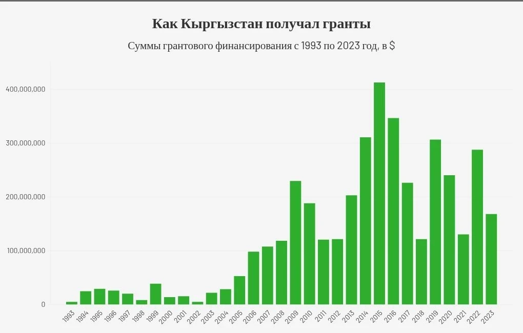 В общей сложности с 1991 по 2023 год объем грантового финансирования составил $4 миллиарда. Наибольшую сумму республика получила в 2014-2016 годах — $1,07 миллиарда. Наименьшие гранты, по $5 миллионов, были получены в 1993 и 2002 годах. Основная часть грантов была направлена на бюджетную поддержку — $1,3 миллиарда.