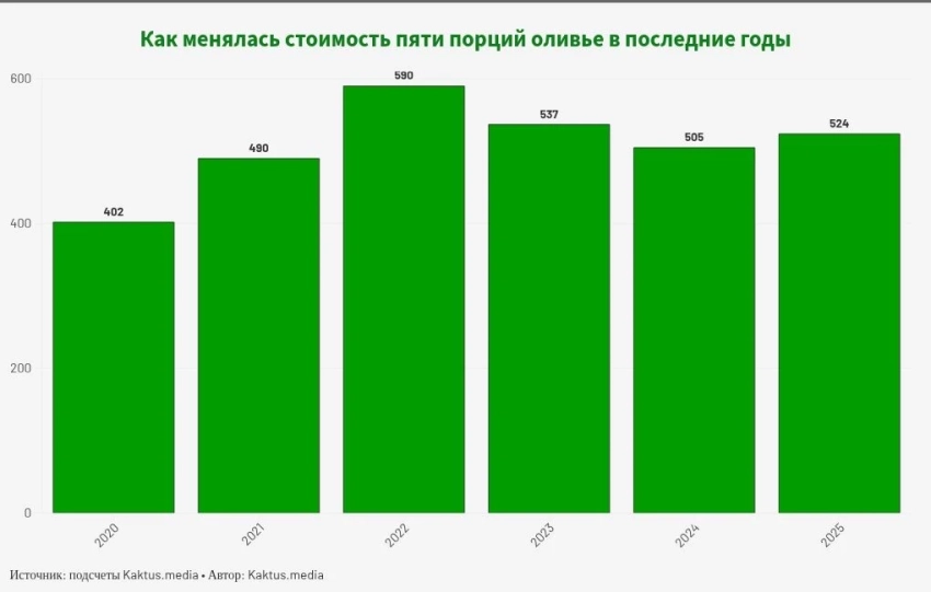 На протяжении последних шести лет Kaktus.media отслеживает стоимость одной порции оливье. За это время салат подорожал почти на 122 сома, что составляет около трети от первоначальной стоимости. Рекордная цена была зафиксирована в 2023 году, когда стоимость оливье почти достигла 600 сомов.Анализ показывает, что наибольшее повышение стоимости произошло у колбасы (на 69 сомов) и майонеза (на 28 сомов). Однако один из ингредиентов, а именно горошек, подешевел на 4 сома (5,9%). В декабре 2022 года, когда оливье было особенно дорогим, наблюдалось резкое удорожание вареной колбасы, огурцов и майонеза. В декабре 2023 года цены на все эти продукты, кроме колбасы, снизились, что привело к снижению общей стоимости салата.