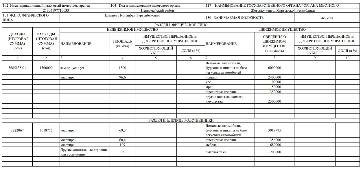 Близкие родственники Сыдыгалиева задекларировали доход в 2 млн 698,8 тыс. сомов и расходы в 4,9 млн сомов. В их активе есть квартира площадью 210 кв. м и автомобили на сумму 4,9 млн сомов.