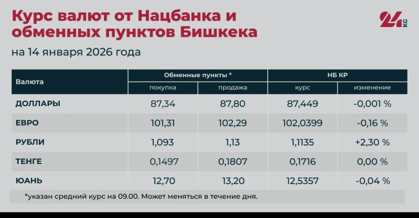 По данным Национального банка Кыргызстана и обменных пунктов Бишкека, официальные курсы доллара, евро и китайского юаня показали снижение, в то время как рубль России укрепился. Казахстанский тенге остался без изменений.