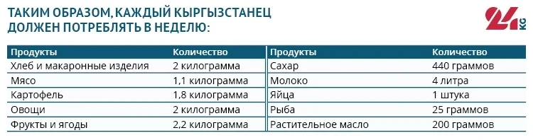Нормы питания для граждан Кыргызстана были утверждены правительством еще в 2009 году. Согласно этим нормативам, каждый житель должен ежемесячно потреблять 9 видов продуктов питания.