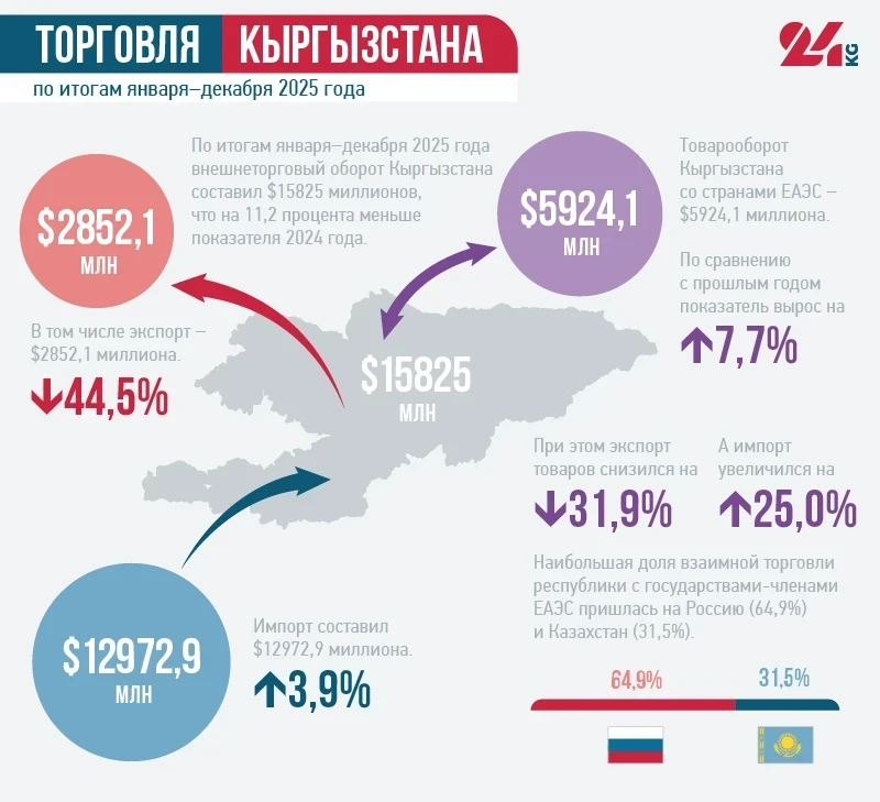 Согласно данным Национального статистического комитета, общая сумма внешней торговли Кыргызстана в 2025 году составила $15 миллиардов 825 миллионов, что является снижением на 11,2% по сравнению с 2024 годом.