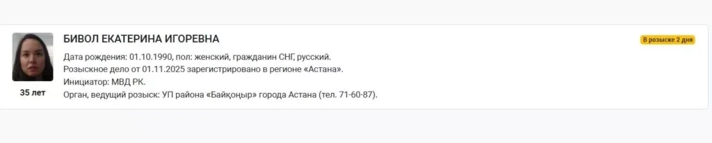 По информации, содержащейся в ориентировке, Екатерина Бивол была объявлена в розыск по запросу Министерства внутренних дел Казахстана. Уголовное дело было зарегистрировано 1 ноября 2025 года в столице, и расследование ведется сотрудниками полиции района Байконыр.
