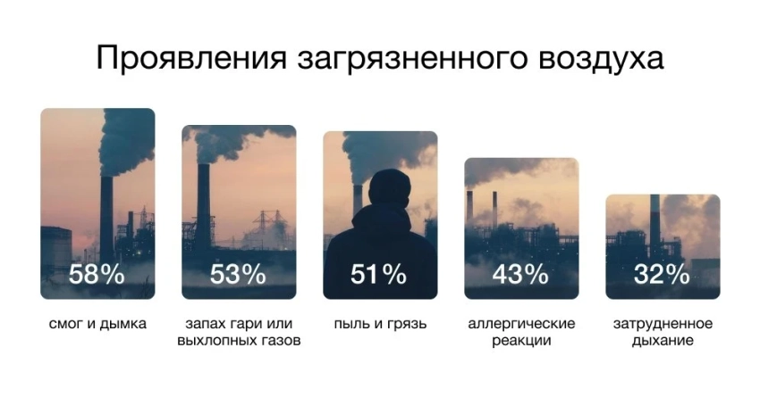 Около 80% опрошенных отметили, что грязный воздух негативно сказывается на их здоровье. Наиболее распространённые симптомы: