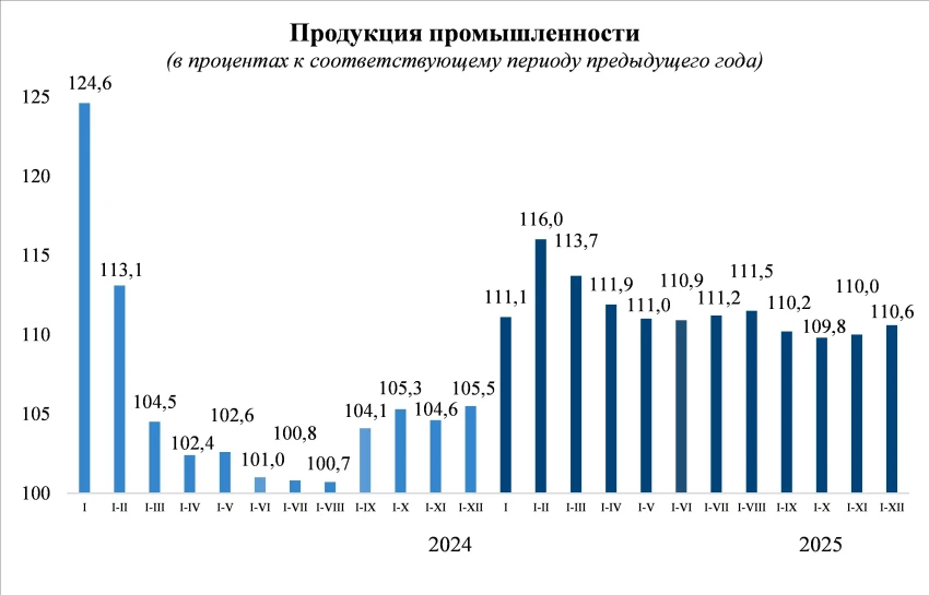 Объем промышленной продукции за 2025 год составил 799,7 миллиарда сомов, что на 10,6% больше, чем в 2024 году. Основными факторами роста стали высокая производительность в фармацевтике (увеличение в 1,7 раза), а также в производстве строительных материалов (на 35,7%), резиновых и пластиковых изделий (на 35,7%), а также в полиграфии (на 30,5%), и пищевой промышленности (на 30,1%).