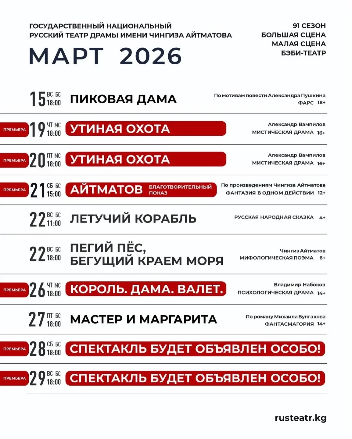 В Бишкеке Государственный национальный русский театр драмы имени Чынгыза Айтматова анонсировал свою программу на март 2026 года.