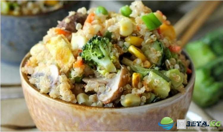 Ингредиенты: киноа (или пшено) – 1 чашка, растительное масло – 2 ст. л., чеснок (измельченный) – 1ст.л., имбирь (измельченный) – 1 ст. л., грибы – 220 г, брокколи – 340 г, морковь (нарезанная) – 2 шт., горох (можно взять замороженный) – 1 ст., яйца – 2-3 шт., соевый соус – 4 ст. л., зеленый лук (нарезанный) – 2 шт.