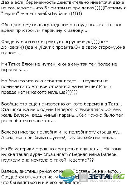 Если еще совсем недавно многие сочувствовали Тате Абрамсон из-за ее отношений с Валерием Блюменкранцем, который не отличался выдержкой и терпением, то теперь ситуация изменилась, и большинство зрителей с грустью наблюдает за теми унижениями, что приходится переносить Валере, не понимая при этом, откуда парень берет силы, чтобы терпеть подобные издевательства, пишет сайт www.gazeta.kg.
