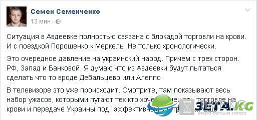 Ситуация в Авдеевке полностью связана с блокадой торговли на крови. И с поездкой Порошенко к Меркель, причем не только хронологически. Об этом нардеп Семенченко написал на своей странице в социальной сети Facebook.