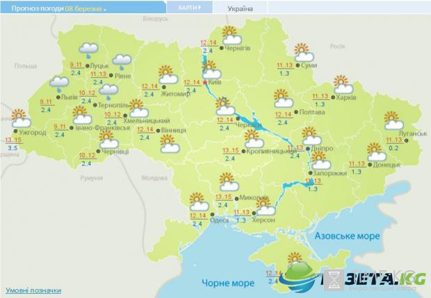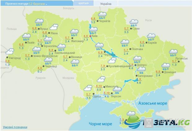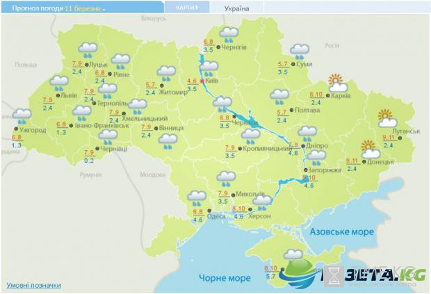 В пятницу, 10 марта, ночью в западных, днём на Правобережье небольшие, местами умеренные дожди, в Карпатах с мокрым снегом.
