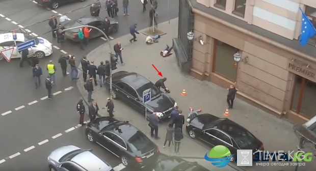 Неизвестный оператор появляется на видео в 3.06 с уже включенной камерой и начинает снимать место преступления. Какое-то время он снимает общий план, после чего с близкого расстояния фиксирует на камеру убийцу Вороненкова.