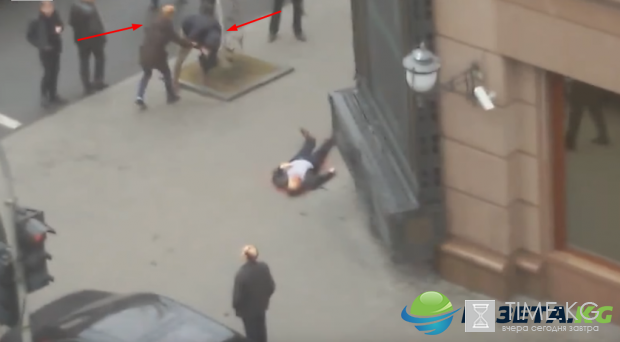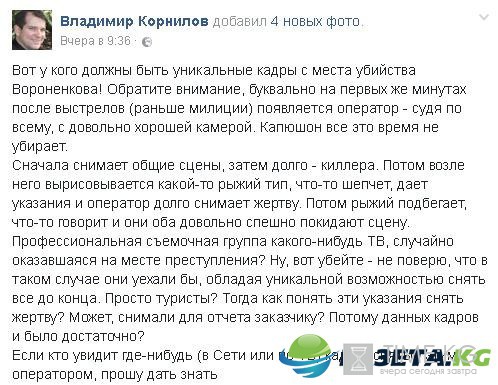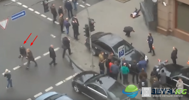 Позже мужчина с камерой перемещается к перекрестку и снимает убитого Вороненкова. Наконец к нему подходит еще один человек и, судя по всему, предлагает оператору уходить с места событий. Сразу посе этого с отснятым материалом они исчезают. "Сначала снимает общие сцены, затем долго - киллера. Потом возле него вырисовывается какой-то рыжий тип, что-то шепчет, дает указания и оператор долго снимает жертву.