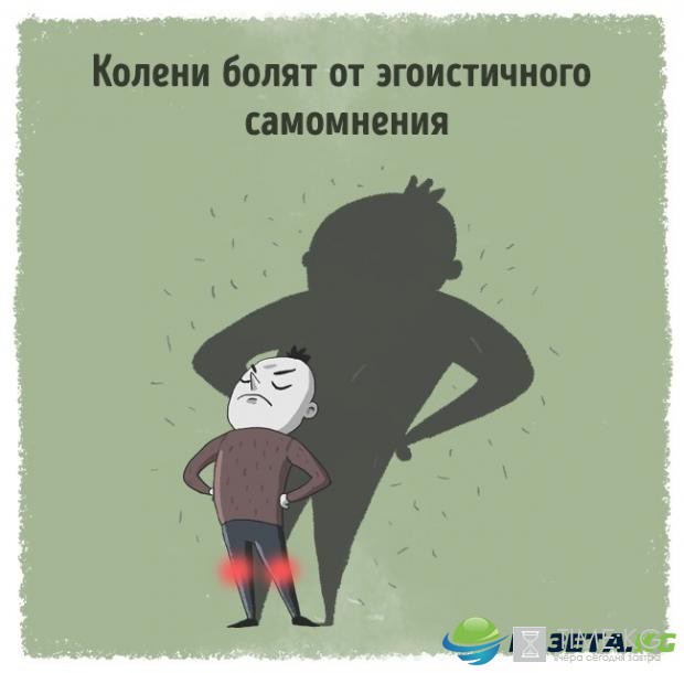 Боль в коленях, вероятнее всего, является признаком сильно раздутого «я». Колени болят, когда мы слишком много думаем о себе и слишком мало о других, когда мы твердо и бескомпромиссно уверены, что мир вращается вокруг нас.