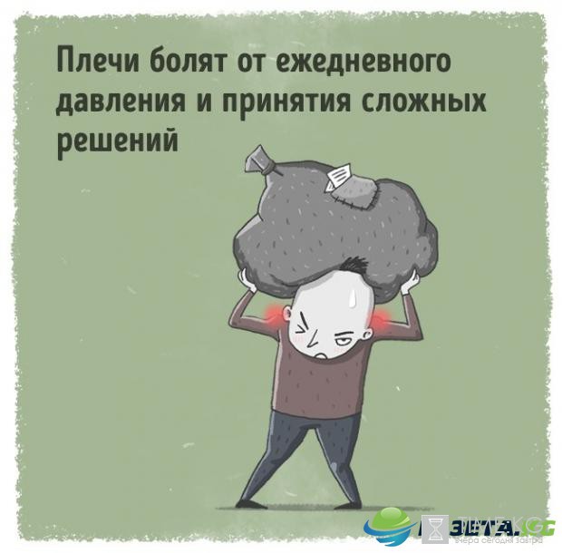 Боль в плечах говорит о том, что мы носим тяжелую эмоциональную нагрузку, находимся под большим эмоциональным давлением. Возможно, кто-то в нашем окружении давит на нас. Или мы не можем принять важное решение, и оно лежит на наших плечах тяжким бременем.