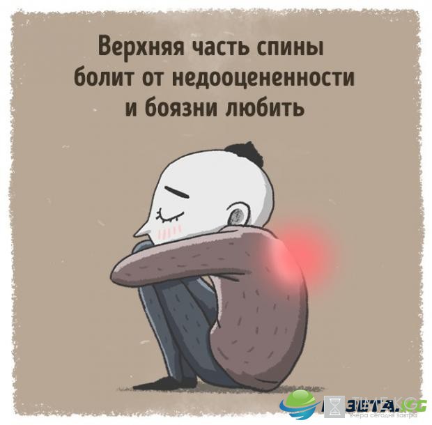 Боли в этой области говорят об отсутствии эмоциональной поддержки, о нехватке близких людей рядом. Когда мы подсознательно чувствуем себя нелюбимыми или недооцененными.