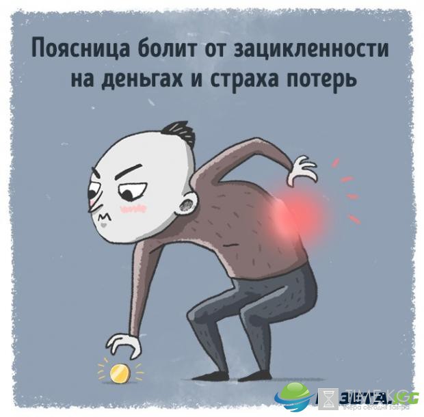 Если мы постоянно волнуемся о деньгах, у нас может ныть поясница. Возможно, собственная тайная зависть богатой жизни никак не дает покоя либо близкие постоянно заставляют переживать по поводу денег.