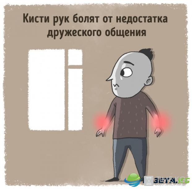 Руки болят у тех, кто давно и сильно нуждается в дружбе. У тех, кому не хватает расслабления и простого дружеского общения с другими людьми. Если у вас ноют кисти рук — это сигнал о том, что пора выходить из своего замкнутого мирка.