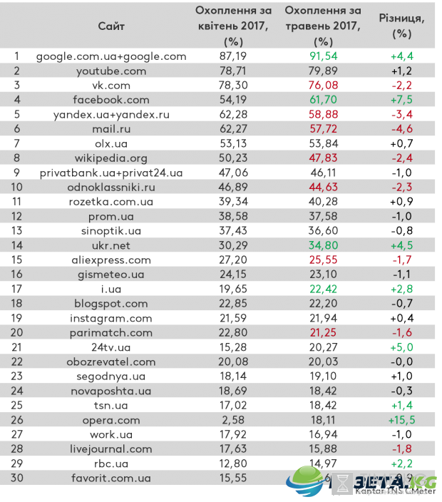 Рекордсменом по росту в мае стал сайт Opera.com, который набрал дополнительных 15,5% охвата и впервые вошел в ТОП-30 вообще. На победной волне роста также находится охват Facebook.com, которое выросло на 7,5% и подняло соцсеть с 6 на 4 место рейтинга. На третьем месте по величине прироста охвата новостной ресурс 24tv.ua с 5% ростом, за ним следует Ukr.net с 4,5% роста. Увеличились охват и новостных сайтов Tsn.ua (+1.4%) и Rbc.ua (+2,2%).