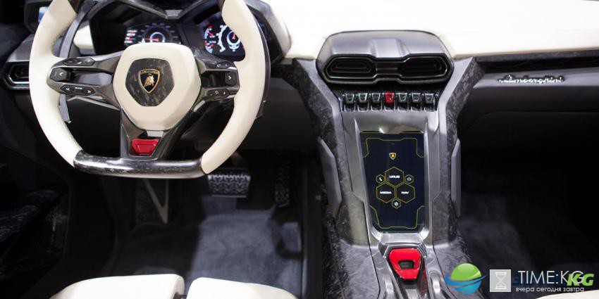 Большинство элементов панели кроссовера разработчики выполнили из углепластика. Интерьер новинки отличается четкими геометрическими мотивами, а спортивную нотку придают кресла и рулевое колесо, у которого усечен внизу ободок. Салон Lamborghini Urus в черном и белом цветах, а в отделке есть такие материалы как мраморный пластик и натуральная кожа. Хромированные накладки на дверях делают автомобиль более элегантным. В Lamborghini Urus установлена спортивная приборная панель, которая имеет цифровое управление. Центральную консоль дизайнеры решили вынести на отдельную панель в форме трапеции, которую установили под небольшим наклоном. В концепте есть два сенсорных монитора для пассажиров, которые сидят как спереди, так и сзади.
