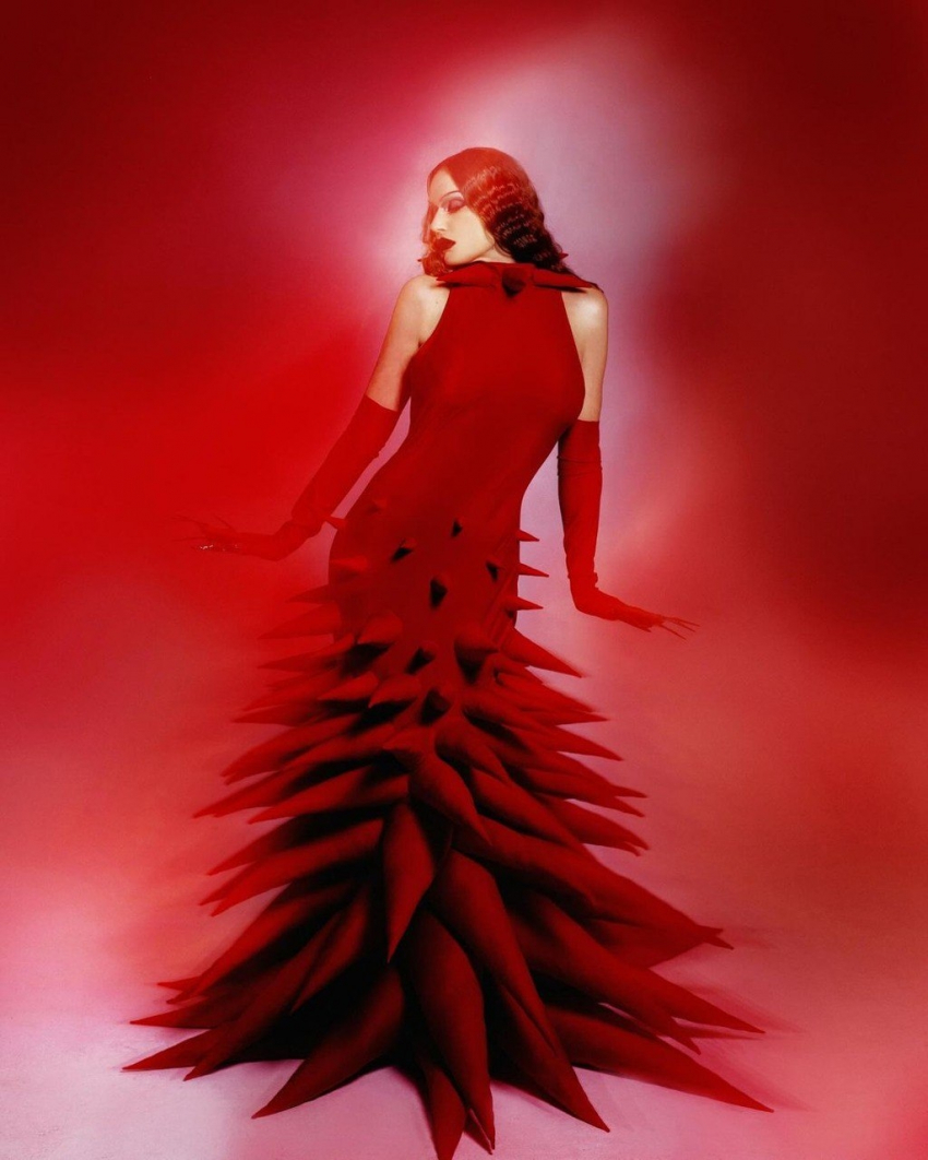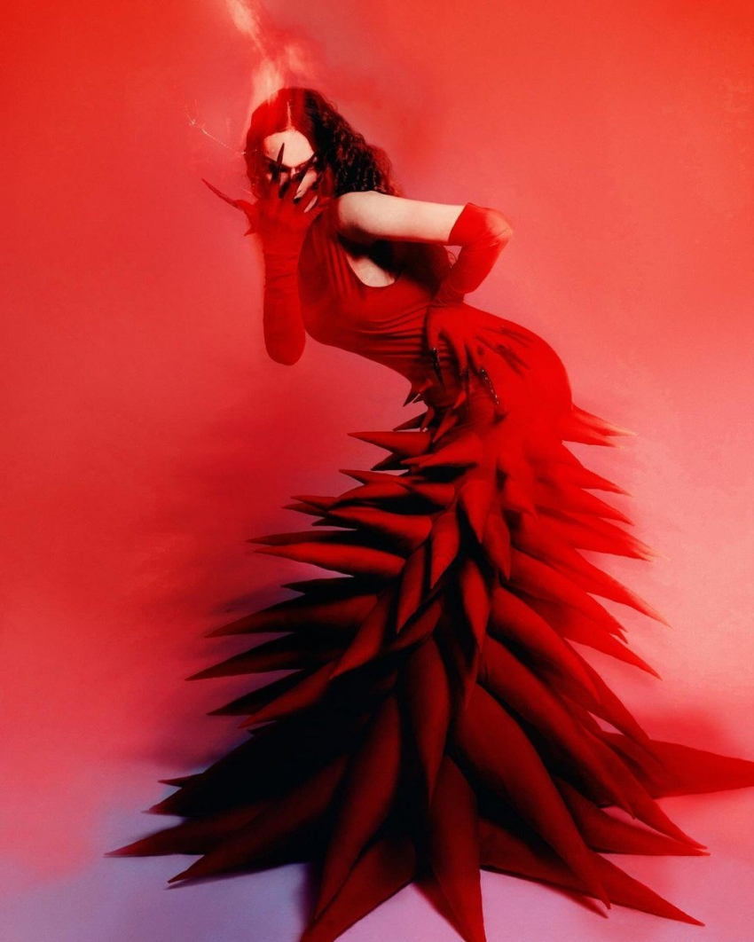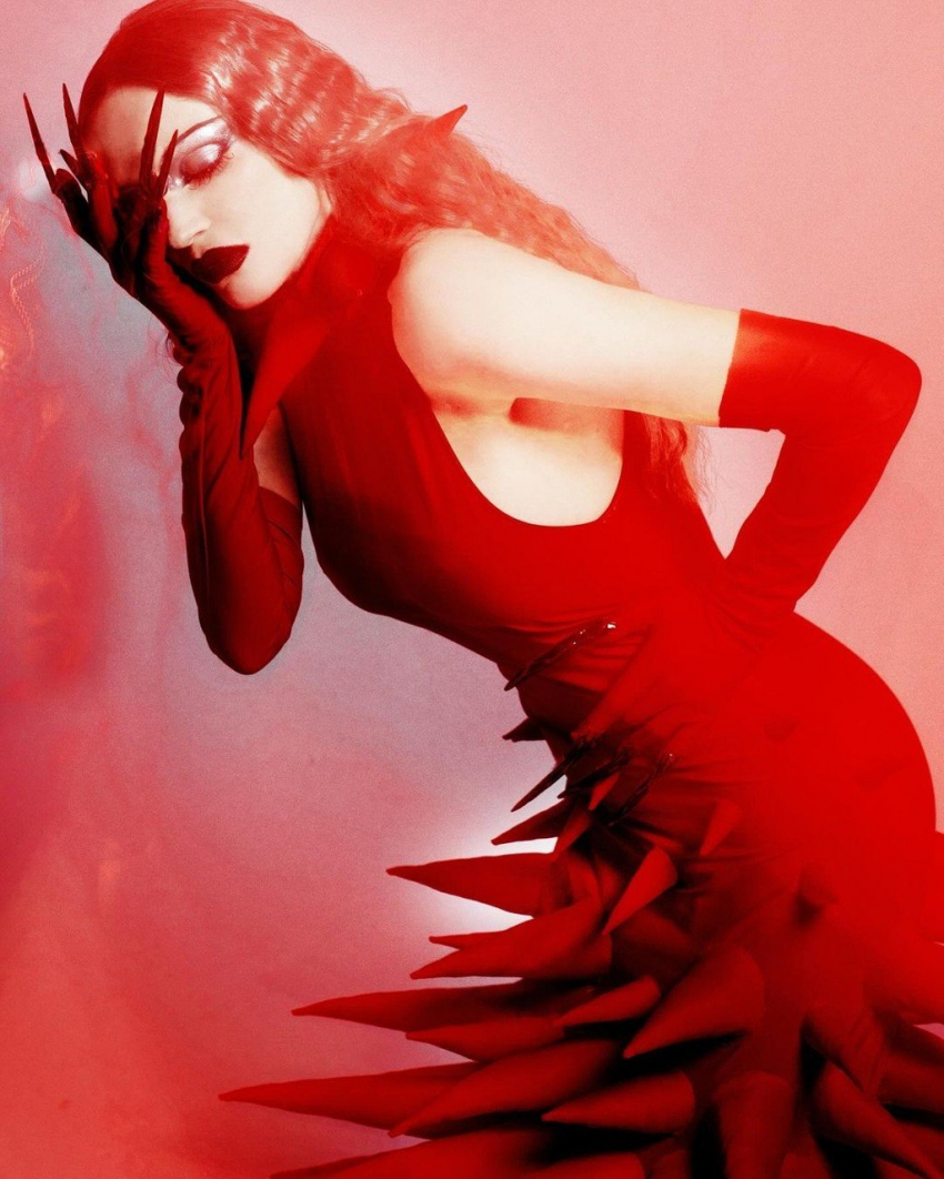 Одетая в красное платье с «шипами» и такого же цвета перчатки, заканчивающиеся выше локтя, Алена Водонаева поразила подписчиков ярким и драматическим образом женщины-вамп с пронзительным взглядом.