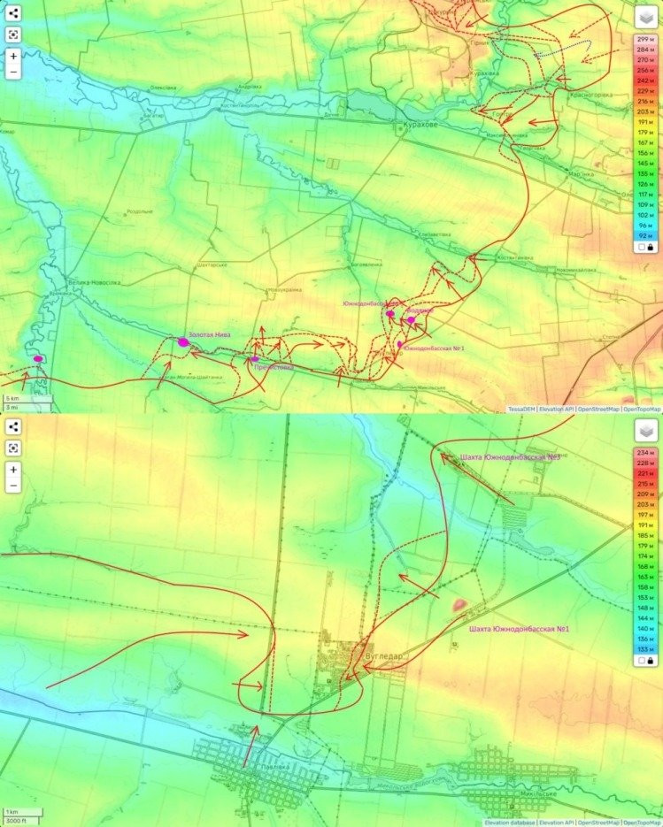 На Селидово-Кураховском направлении основные бои здесь происходят в районе Цукурино. Именно сюда противник бросает резервы, пытаясь не дать нашим частям прорвать эту свою последнюю удобную линию обороны, но пусть и с трудом но наши штурмовики ее прогрызают.