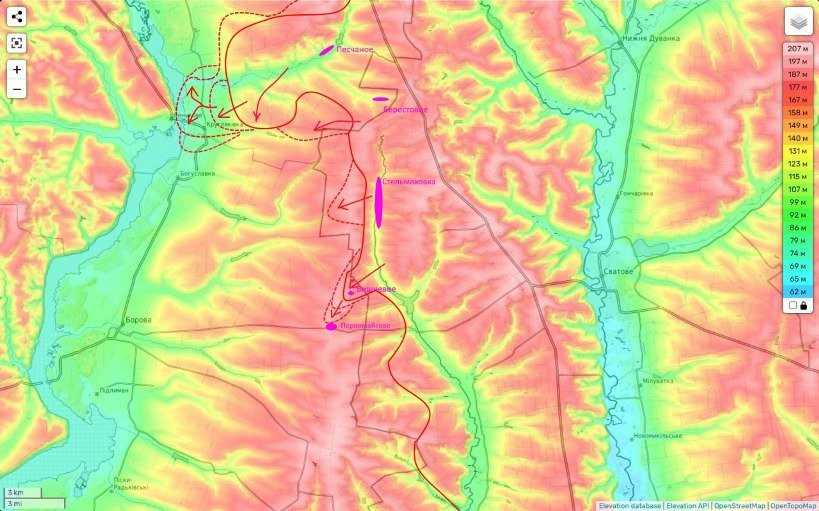 Одновременно с этим очевидно мы будем пробовать наступать на этот районный центр Харьковской области с севера (вдоль реки Оскол).