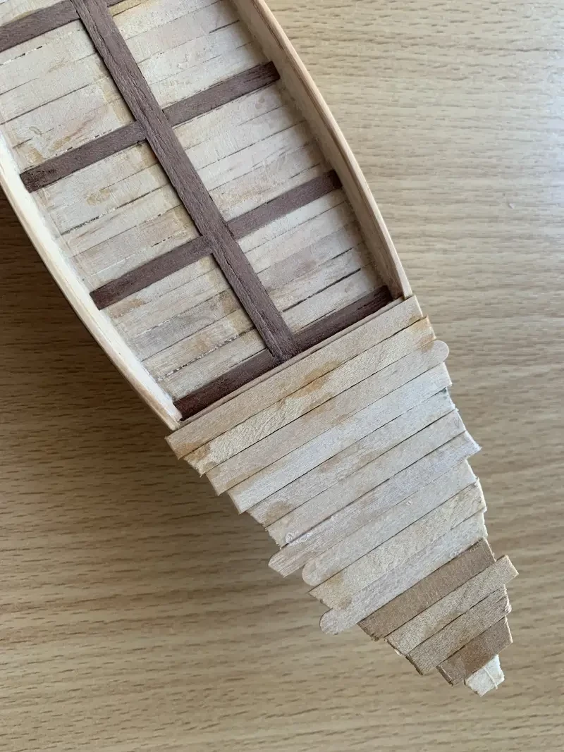 Вот так палочки-мешалочки обшивки укладываются на бумажную основу. Сгибать по профилю корпуса их вовсе не обязательно. Всю поверхность можно закрыть прямоугольными «кирпичиками», лишь немного обточив их края напильником, чтобы они плотнее подходили друг к другу.