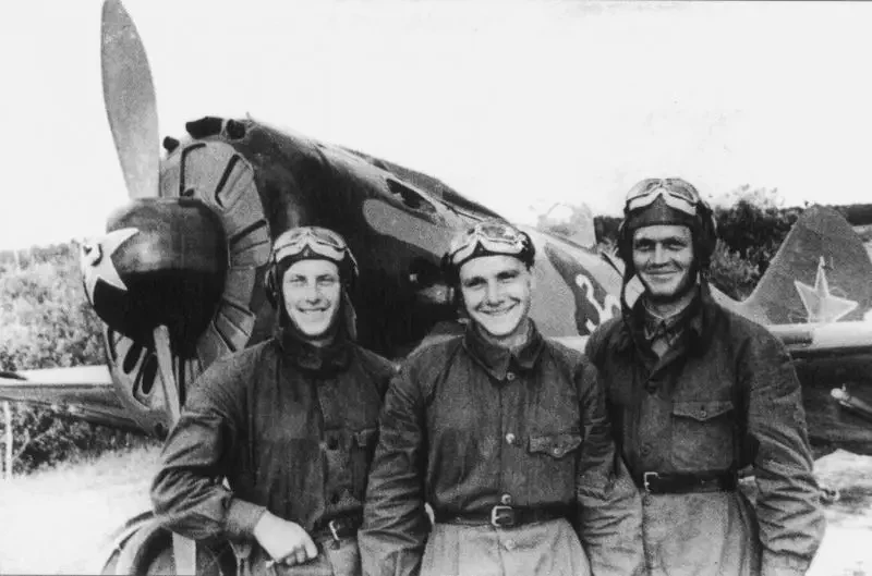 Советские летчики-сержанты С. Слесарчук, С. Гозин и А. Перевера из 34-го истребительного авиаполка ПВО Москвы у истребителя И-16. Истребитель И-16 оснащен направляющими для реактивных снарядов РС-82. На борту машины надпись «За Родину». 1942 г.