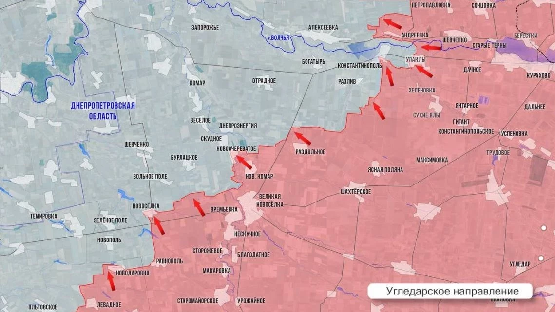 На Угледарском направлении ВС РФ продвигаются вдоль западного и восточного берегов р. Мокрые Ялы, отвлекая резервы противника, так необходимые сейчас в районе Богатыря и Константинополя. С опорой на вчера освобождённое село Новоочереватое наши атакуют Скудное и Днепроэнергию, продвигаются к Комару. Выход в район Комара позволит нашим блокировать группировку противника в Богатыре и выйти в Днепропетровскую обл с юго-востока, обходя с тыла основные оборонительные линии ВСУ в Запорожской обл. На днях был ликвидирован карман восточнее оборонительной линии противника Андреевка-Улаклы, а сегодня наши продвигаются западнее. В Андреевке ВС РФ закрепились в западной части, а противник оставил свои позиции в восточной части села.