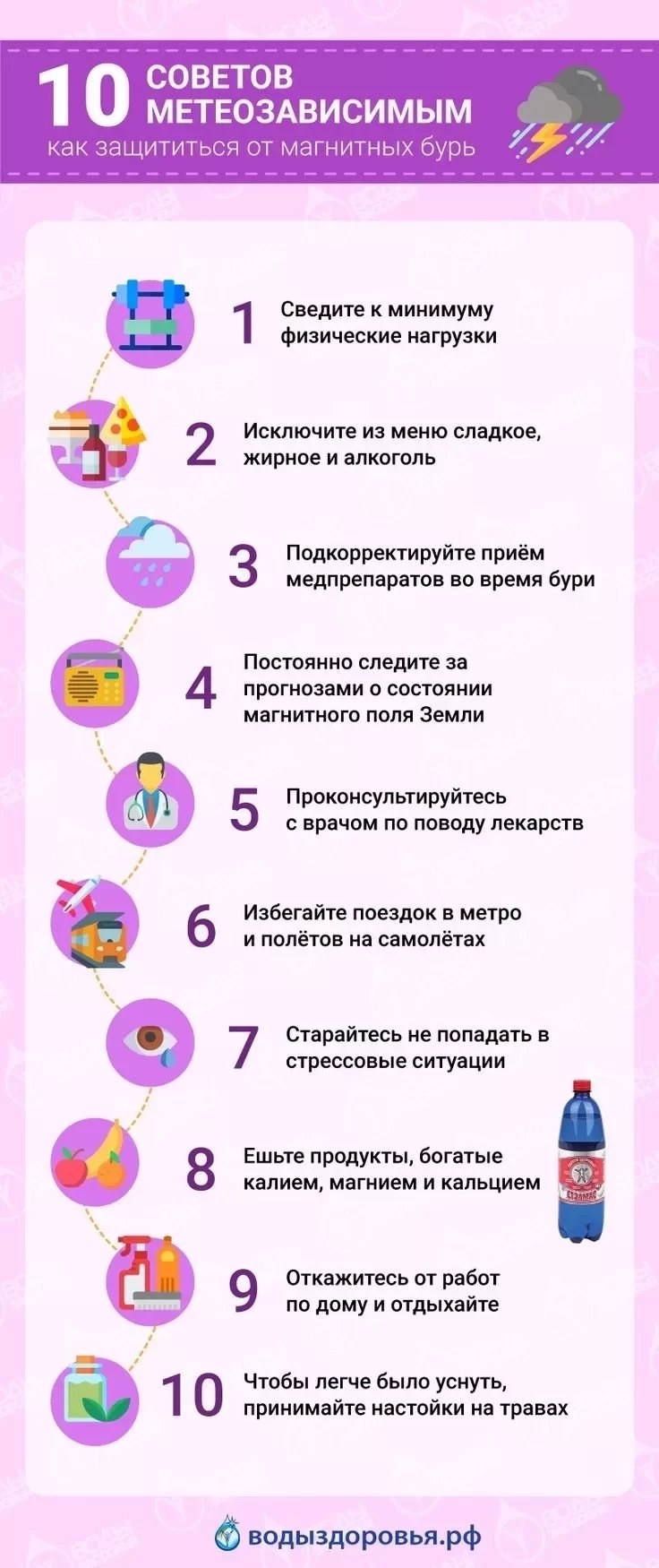 Буря способна «ударить» по самочувствию еще до того, как разыграется в полную силу, предупредил эксперт. Метеозависимые люди начинают ощущать ее за сутки, а иногда и раньше. Самый частый сигнал - ноющая боль в суставах, поскольку во время магнитной бури давление внутри них меняется, объяснил Чудаков. Также возможны головные боли, слабость, скачки артериального давления и обострения хронических болезней.