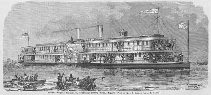 До этого те же волжские пароходы работали на дубовых дровах длиной в аршин, из толстых поленьев, которые получали, раскалывая дубовые кряжи на четыре части. Но уже в 1871 году на Волге появился и первый двухпалубный пароход «Александр II» с нефтяным отоплением. Из двух труб этого парохода валило облако черного дыма, стлавшегося по воде и… отпугивавшее пассажиров, привыкших к пароходам на дровах.