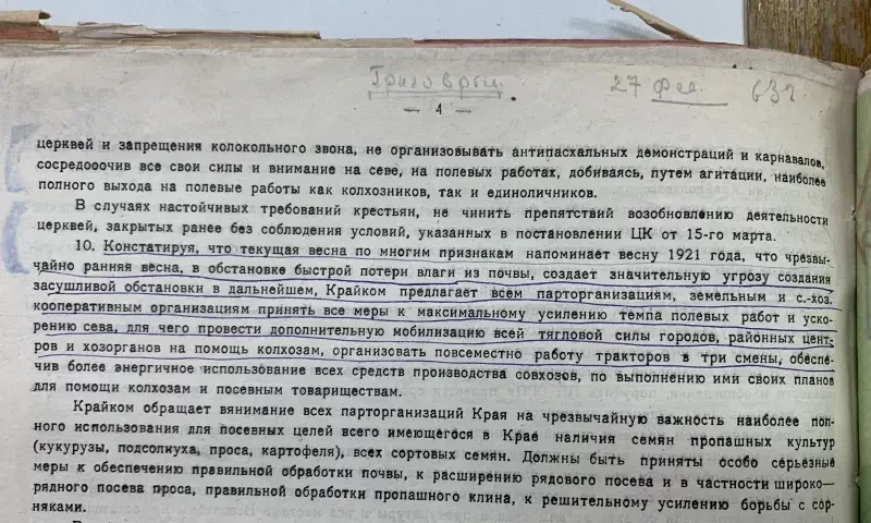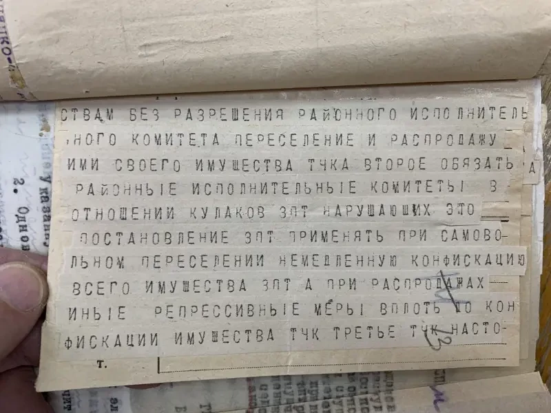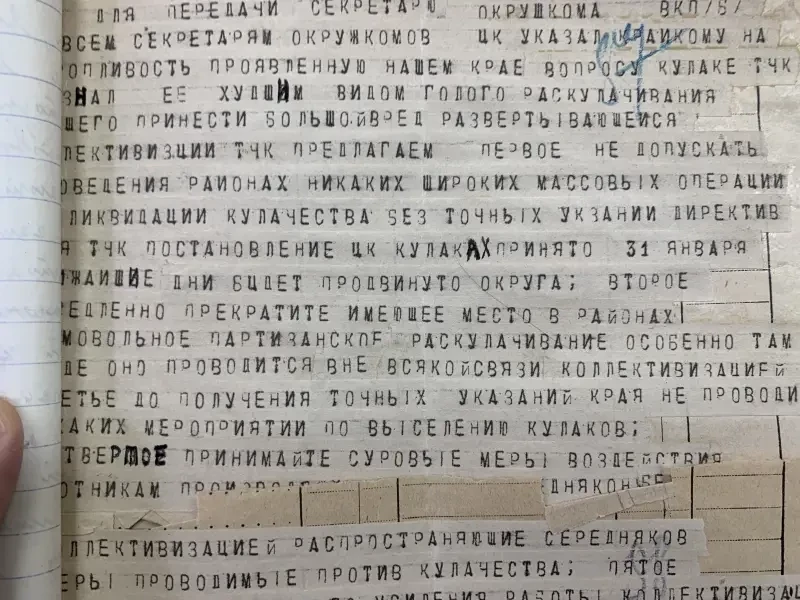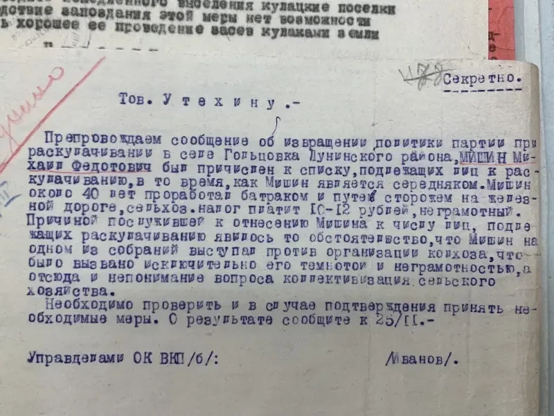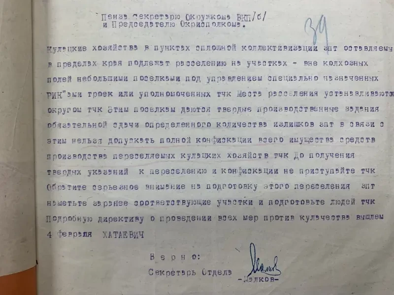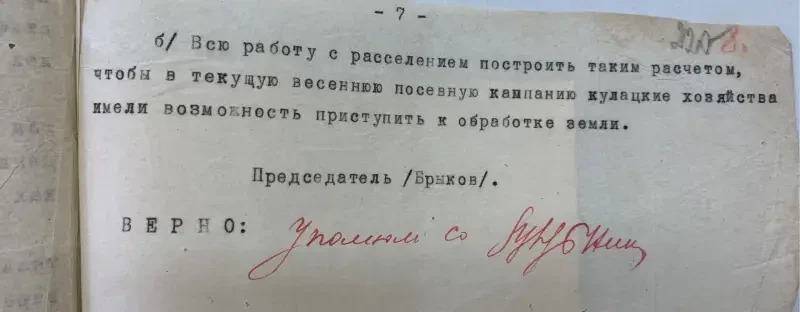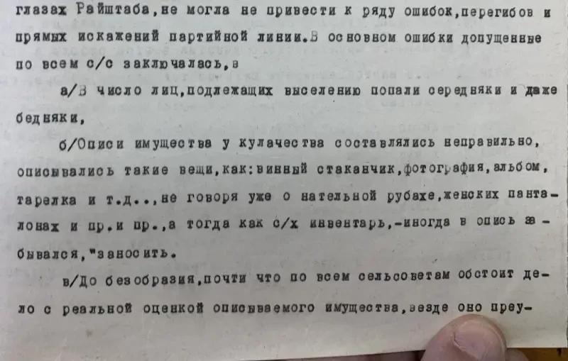 Второй экземпляр этого же села Селиванов Давид Никифорович внесен в списки к выселению за то, что не внес наложенную на него сумму на трактора. Сам же он принадлежит к разряду бедняков, до революции работал батраком в имении Агапова, в прошлом и настоящее время исправный плательщик налогов и ярый защитник всех мероприятий сов. власти. Подобные факты свойственны каждому селу. Райком и Райштаб слишком несерьезно относились к тем процессам, происходящим на селе, не занимались проверкой присылаемого материала…»