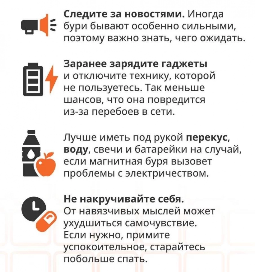 Врачи советуют метеозависимым людям в период магнитных бурь и геомагнитных возмущений более бережно относиться к своему здоровью. Следует, по возможности, избегать стрессов, переутомлений, тяжелых физических нагрузок.