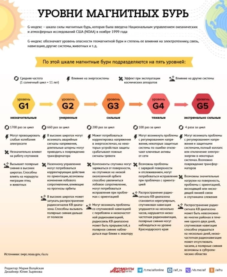 Магнитные бури - это резкие возмущения геомагнитного поля Земли, которые длятся от нескольких часов до нескольких суток. Ученые оценивают магнитные бури по 10-балльной шкале. Штормы до пяти баллов являются незначительными. Более сильные возмущения классифицируют по шкале от G1 до G5.