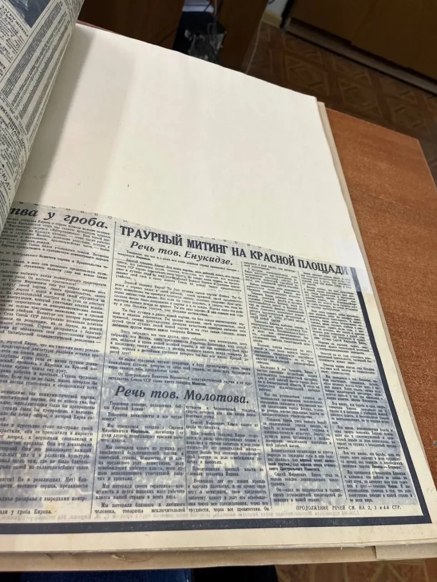 Но не всегда сами архивы тех же газет приходят в целости — здесь реставраторам явно пришлось постараться скрыть этот недостающий фрагмент. В этом номере, посвящённом убийству Кирова, полностью пришла в негодность верхняя часть!