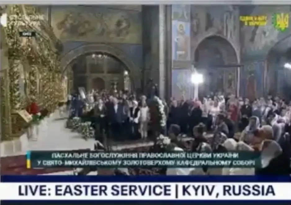 Дело в том, что во время трансляции пасхальной службы из Киева телеканал сопроводил её титрами на английском «Пасхальное служение, Киев, Россия». Позже «ошибку» исправили.