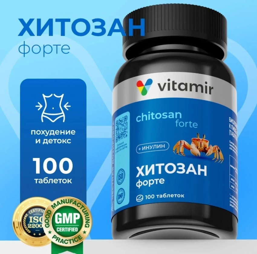 Хитозан форте VITAMIR PRO — достойный представитель в категории «топ БАДов для похудения», особенно для тех, кто ищет двойной эффект: снижение веса и детокс-очищение. Натуральный хитозан действует как липофильный фильтр — он связывает и выводит жиры, токсины и даже тяжелые металлы до того, как они успевают усвоиться. В тандеме с инулином, который нормализует микрофлору кишечника, этот БАД улучшает пищеварение и способствует общему очищению организма. Вдобавок он помогает контролировать уровень холестерина и поддерживает здоровье сердечно-сосудистой системы.