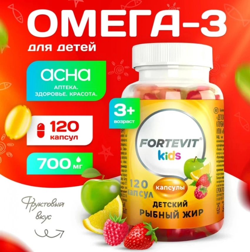 Рыбий жир Омега-3 Fortevit Kids — это отличная добавка для детей старше 3 лет, представляющая собой источник полезных жирных кислот EPA и DHA. Вкусные жевательные капсулы с фруктово-ягодным миксом обеспечат малышей всеми необходимыми нутриентами для нормального роста и развития. Омега-3 поддерживает здоровье сердца, сосудов, мозга, а также улучшает память и зрение. Этот продукт поможет укрепить иммунитет, улучшить состояние кожи и волос, а также снизить риск аллергии и диатеза.