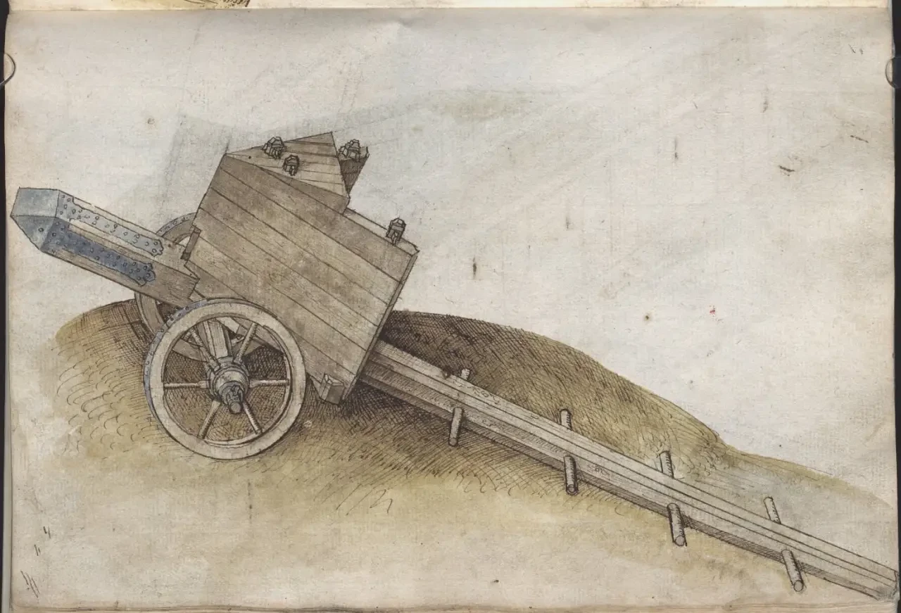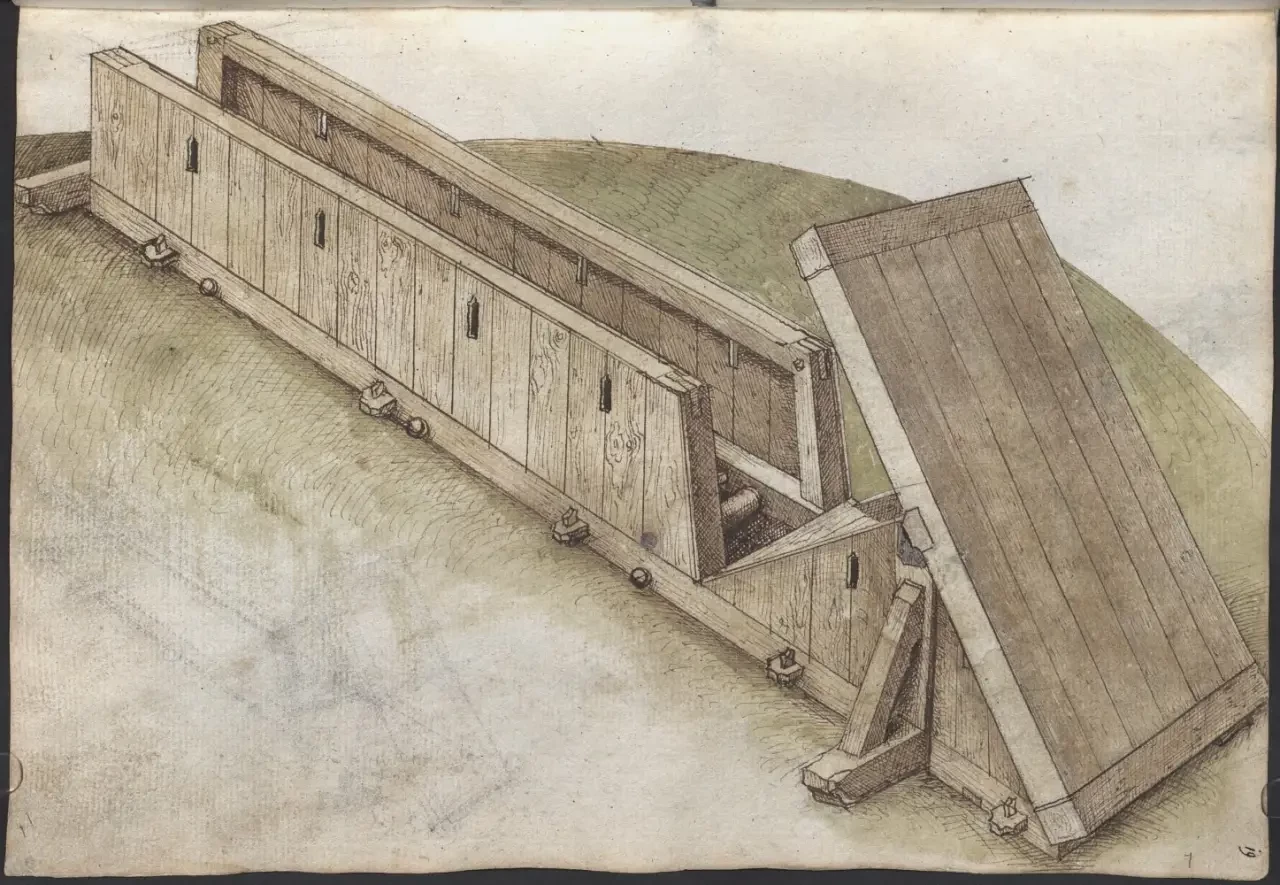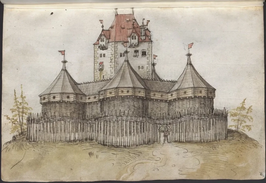 Проект «дешевых укреплений» для замка. Обычная земля, бревна и колья из леса вполне, по мнению Мартина Мерца, могли послужить для создания оборонительных сооружений там, где они отсутствовали. «Книга фейерверков». Мартин Мерц. Северная Бавария/Франкония, I: 2-я половина XV века; 1473 г. Баварская государственная библиотека, Мюнхен
