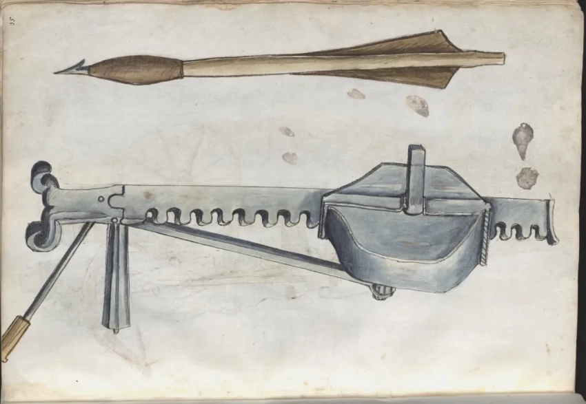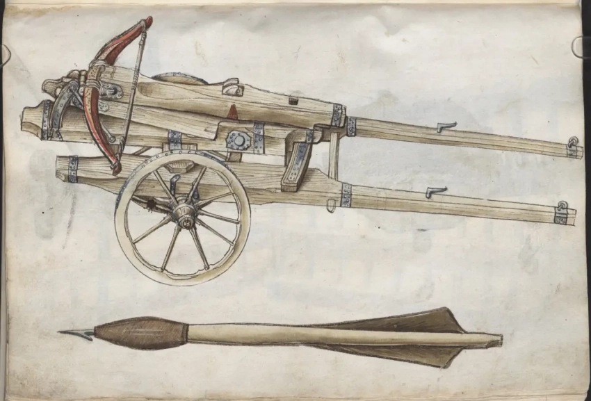Удивительно, но кроме пушек в «Книге фейерверков» имеется и изображение вот такого колесного арбалета и стрелы к нему. Причем стрелы не простой, а явно зажигательной!