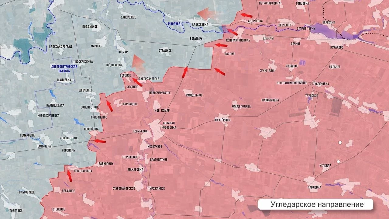 На Угледарском фронте армия России развивает наступление в районе Вольного Поля. Движение наших по направлению к Отрадному и Богатырю осложняется встречными боями. Противник бросает в контратаки всё новые резервы и бронетехнику, однако успеха не достигает, наши упорно продвигаются.