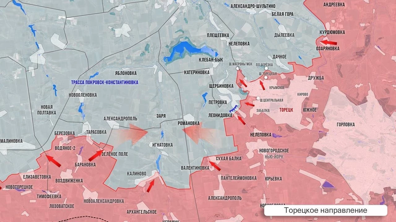 На западном фланге Торецкого направления армия России постепенно ликвидирует карман. Наши существенно расширили зону контроля западнее Сухой Балки и закрепились на позициях за дорогой Донецк-Александро-Калиново. Цель ВС РФ на этом участке - рокада Тарасовка-Романовка, к которой армия России выходит сразу на нескольких участках: у самой Романовки, у Старой Николаевки, на южной окраине которой идут бои, а также в районе Тарасовки. На юго-западе от Торецка ВС РФ продвигаются у Леонидовки, а на северо-востоке, в районе Дачного, - по дороге к посёлку Дылеевка. Продвигаясь на север от города вдоль дороги на Константиновку, ВС РФ пытаются выйти к линии целого каскада ставков, проходящей от Клебанбыкского водохранилища к Дачному, чтобы перерезать логистику противника, идущую вдоль ж/д. Такой манёвр позволит нашим отрезать от снабжения по наиболее короткому плечу гарнизон ВСУ в Петровке, Щербиновке, Катериновке и Клебан-Быке, сообщает Олег Царёв в своём Telegram-канале.