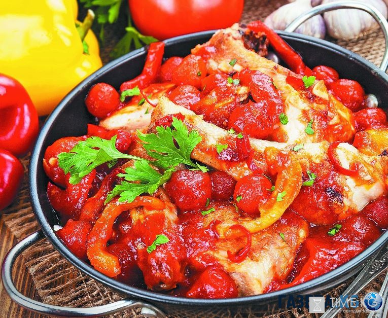 На 6 персон: 1 кг курицы, 2 помидора, 5 помидоров черри, 1 луковица, 1 болгарский перец, 1 красный острый перец, 2 ст. л. растительного масла, 3 ст. л. паприки, 2 ст. л. муки, 200 г сметаны, соль.