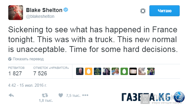 Блейк[/b] Шелтон[/b]: «Я в шоке от новостей из Ниццы. Эта «новая норма» является неприемлемой. Пришло время трудных решений».