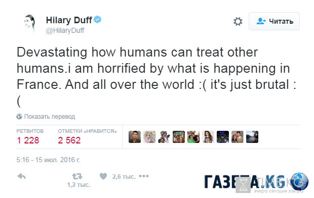 Хилари[/b] Дафф[/b]: «Я поражена тем, как люди могут издеваться над другими людьми. Мне страшно за то, что происходит во Франции (и по всему миру). Слишком много жестокости».