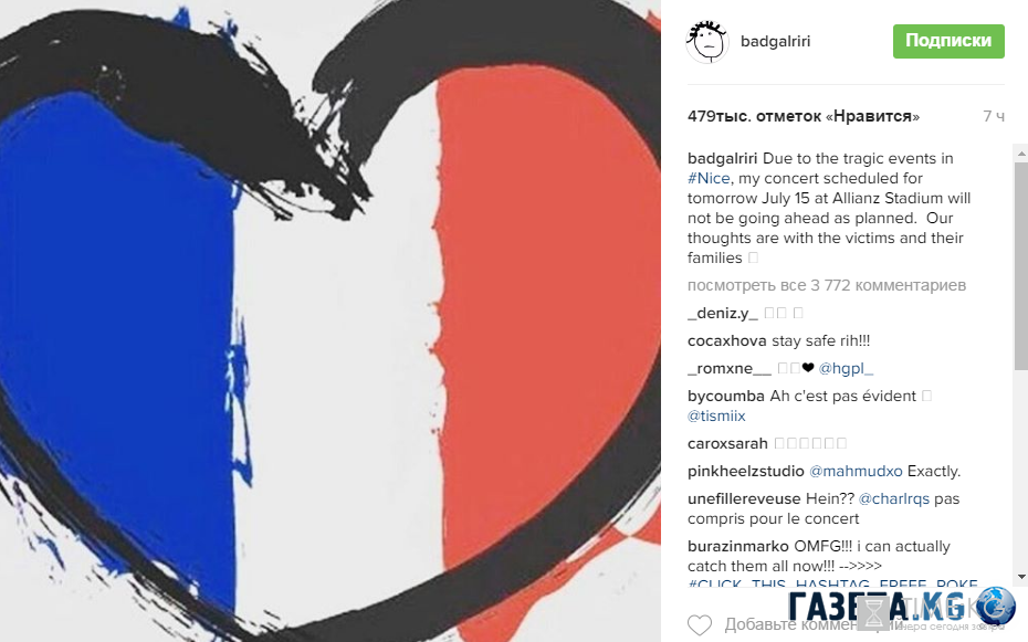 «Из-за трагических событий, которые произошли в Ницце, мой концерт, запланированный на 15 июля в Сиднее, отменен. Мои молитвы с погибшими и их семьями», - написала она в соцсети.