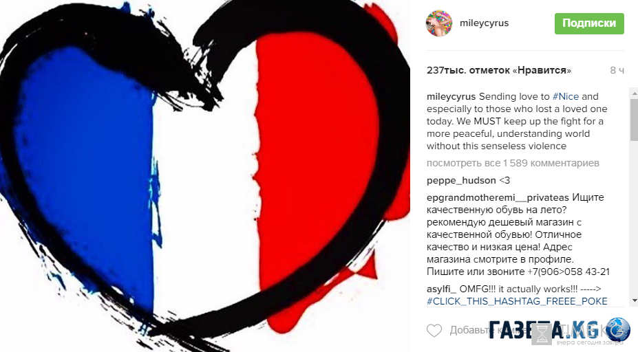 Майли[/b] Сайрус[/b]: «Шлю свою любовь Ницце и особенно тем, кто сегодня там потерял своих любимых. Мы должны бороться за мир без этого бессмысленного насилия».